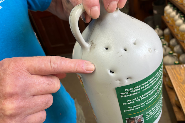 Bear story. Sugarmaker Paul Zononi shows a gallon of syrup chewed up by a bear that snuck into the sugarhouse this spring.